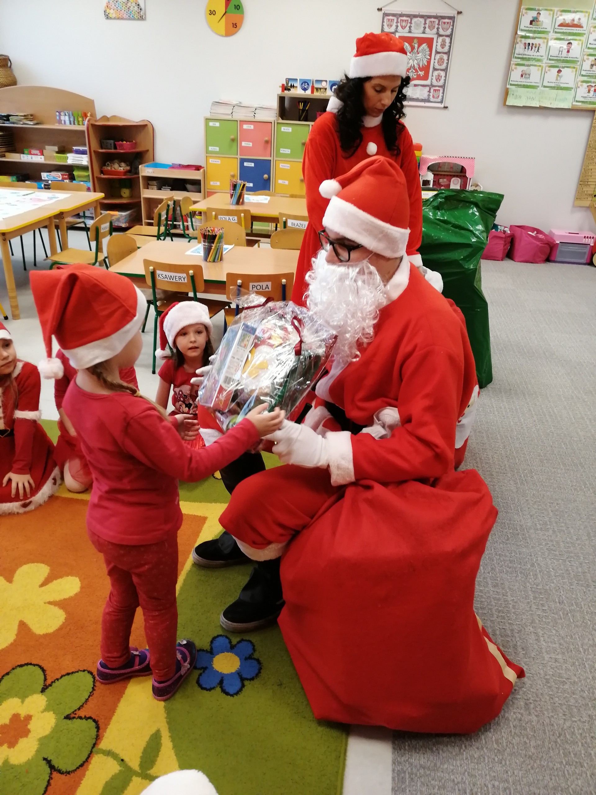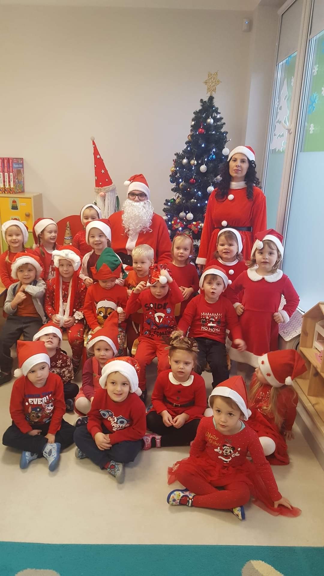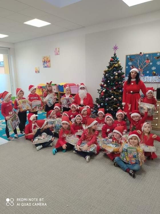 Jak co roku, 6 grudnia nasze przedszkole odwiedził Święty Mikołaj. Już od samego rana dzieci pięknie wystrojone nasłuchiwały charakterystycznego dźwięku dzwoneczka, zwiastującego przyjście długo wyczekiwanego gościa. Święty Mikołaj dotarł na czas. Zmęczony dźwiganiem wielkiego worka z prezentami, ale jak zawsze uśmiechnięty usiadł przy pięknie ubranej choince. Przedszkolaki przywitały Mikołaja wierszem i piosenką, za co zostały obdarowane wspaniałymi upominkami. Każdy przedszkolak z przekonaniem odpowiadał Mikołajowi, że był bardzo grzeczny.